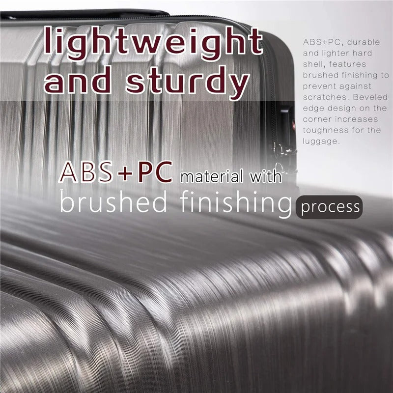 This set consists of three suitcases in a dark grey color with a hard outer shell and a vertical brushed pattern across the surface. Each suitcase has a rectangular shape with rounded edges and a central zipper running around the middle to divide the two halves. The front and back panels feature multiple vertical ridges. All three cases include a telescopic handle with two metal rods and a dark grip at the top, along with a fixed top handle and a side carry handle. A built-in lock is positioned on the side near the zipper. Each suitcase is equipped with four double wheels mounted at the corners. The interior, shown opened, is lined and divided into two sections, with one side featuring a zippered mesh panel and the other side equipped with elastic cross straps.